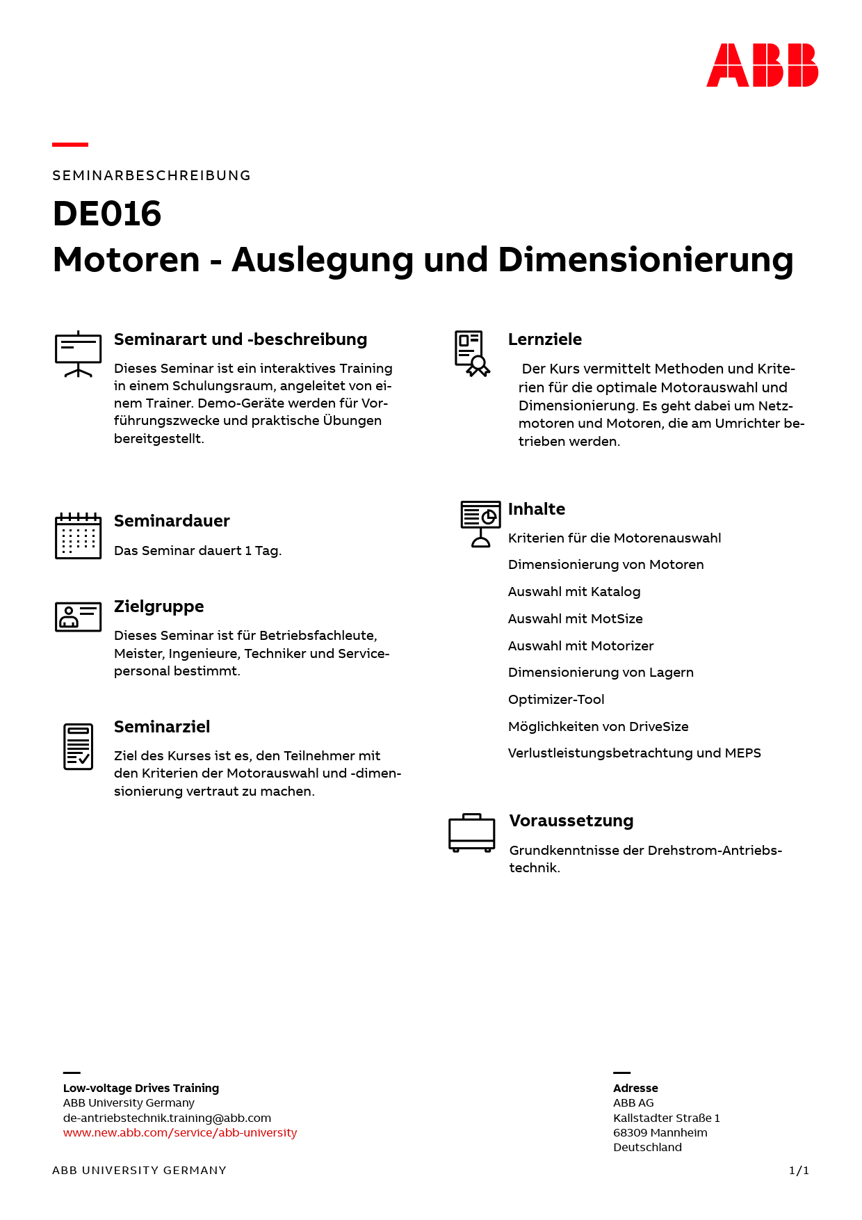 | Kontakt | ABB Motion University Kallstadter Str. 1 68309 Mannheim Tel. +49 621 381 7000 |